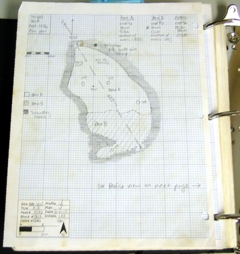 The second, and most rarely used, technique I employ to make maps is by scanning in aerial photos and tracing physical features visible from the air. This method isn't the most accurate. However, it comes in handy when previous excavations at a site haven't been tied into a known datum or the datum information is lost. A datum is a recorded point that has an absolute location that is used to tie in the location of everything on a map. With an aerial photo of a previous excavation I can use unchanged landmarks on the photo, such as buildings and roadways, to tie in the previous excavations with our excavations.